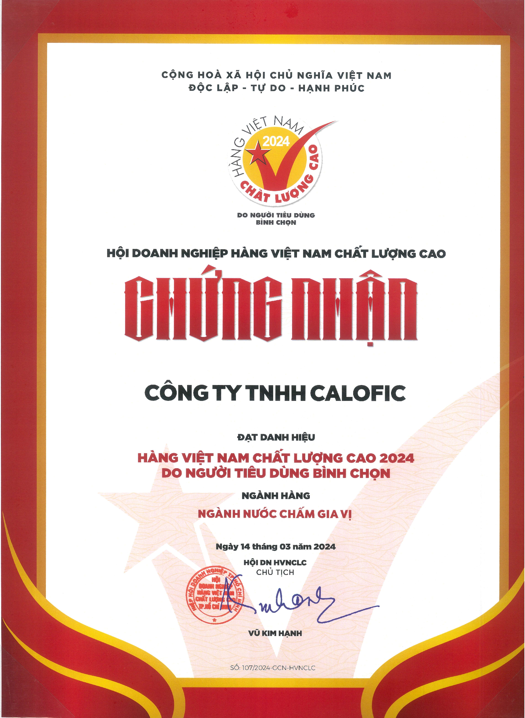 Tại buổi lễ, Công ty TNHH CALOFIC đã được trao bằng chứng nhận. Đây là năm thứ 25 liên tiếp CALOFIC nhận được chứng nhận này. Sự nỗ lực của CALOFIC, thông qua các sản phẩm chất lượng đưa tới người tiêu dùng được ghi nhận, tin tưởng, yêu thương. Đó cũng chính là lý do chúng ta vinh dự nhận được những chứng nhận giá trị này.