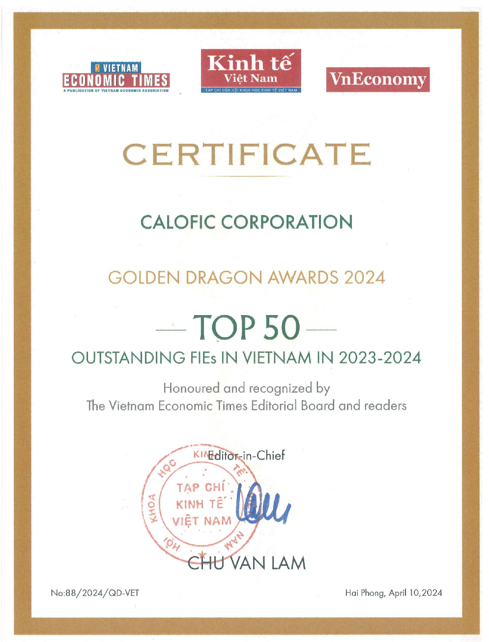 CALOFIC tiếp tục đón nhận giải thưởng Rồng Vàng